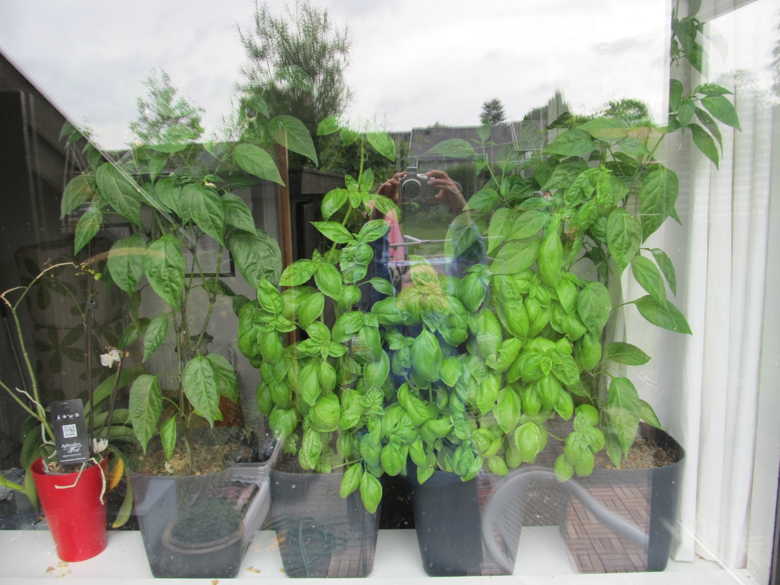 Og også i vindueskarmen vælter det frem med grønt. Chili og basilikum. Begge ting, som jeg ikke kunne finde ud af at dyrke før, men Ikeas billige selvvandingskrukker (Nektarin, hedder de) er altså helt geniale til det formål.