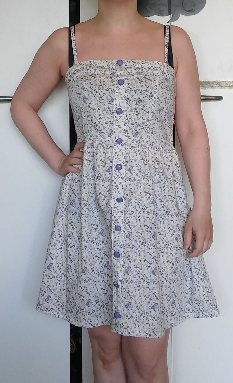 The dress has detachable straps, but the hooks was bend out of shape. I removed them and stitched the straps to the dress, keeping the straps adjustable.