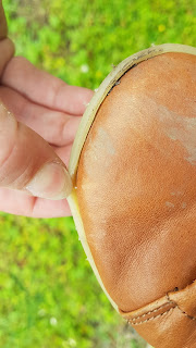 The sole is only sewn, not glued, all the way around, and it causes a problem when I god “offroad” in them: Dirt collects in the crack between the sole and the upper. I plan to put