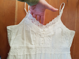 Desuden syede jeg et stykke elastikblonde på udskæringen foran, for nu hvor min volumen er større, var min kavalergang en anelse mere fremtrædende, end jeg følte mig godt tilpas med.